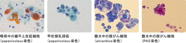 喀痰や尿中の細胞、乳腺や甲状腺を針で刺して採取した細胞などから、プレパラート標本を作製し、異常な細胞の有無を調べます。