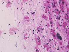 | 塗抹検査 | 検査材料をスライドグラスに塗り、染色して顕微鏡で観察します。 染色性や形から、病原菌の推定を行います。 重要な所見があれば、随時電話報告をしています。 |