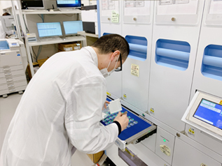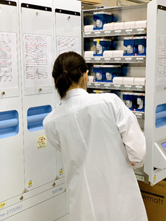 - 新病院への引っ越しを機に注射薬自動払出装置を導入しました。薬とラベルが1処方ごとにトレーにセットされた状態で払い出され、調剤の正確性向上、作業時間の短縮に繋がっています。返品された薬を自動で仕分けたり、使用期限の迫った薬を優先して払い出したりすることも可能です。