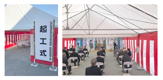 山口市長、地元町内会長・自治会長を来賓に迎え、設計事務所、工事関係者、済生会山口県支部・病院関係者が出席しました。