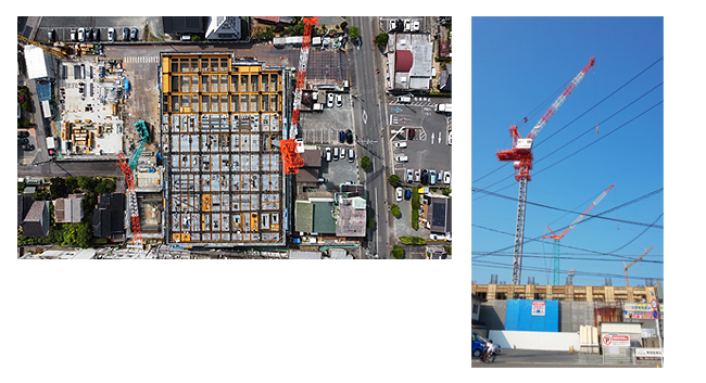 タワークレーやクローラクレーン(移動式クレーン)などの大型重機を使用し、躯体工事が行われています。