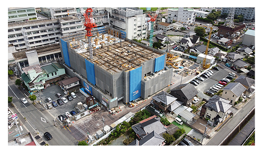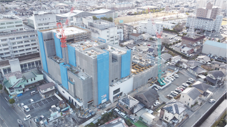 現在、大型クレーン2機で資材搬入等を行い、12月末頃には概ね2階の床までコンクリート打設が完了します。