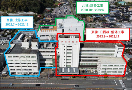 9月より進めてきました西棟改修工事と引越しが完了し、12月5日(月)より北棟と西棟での運用開始となりました。西棟は既存病院を改修したため、動線等が変更しており不便、ご迷惑をおかけいたしますが、何卒ご理解とご協力をお願いいたします。また、出入り口の変更に伴い駐車場から病院出入り口までの経路の変更等、大変なご不便、ご迷惑をおかけいたしますが、何卒ご理解とご協力をお願いいたします。