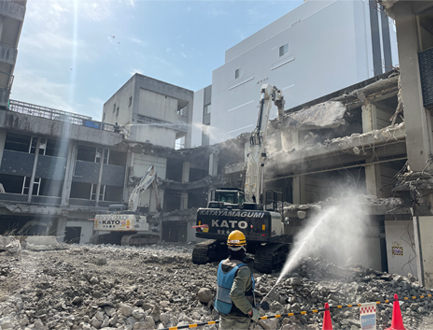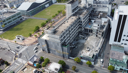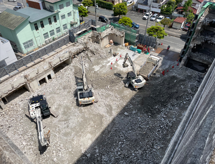 1月の解体工事着手から約5ヶ月が経過し、旧西棟の地上解体も順調に進んでいます。今後は、東棟の内装解体を行い、大型重機による建物解体を行っていきます。