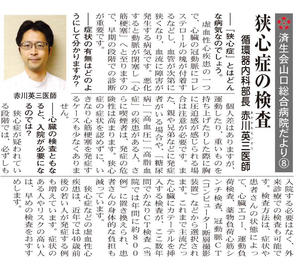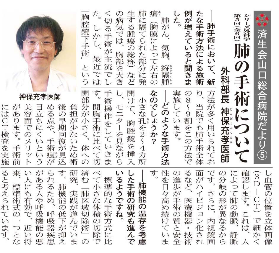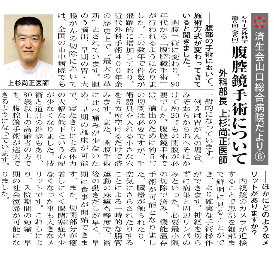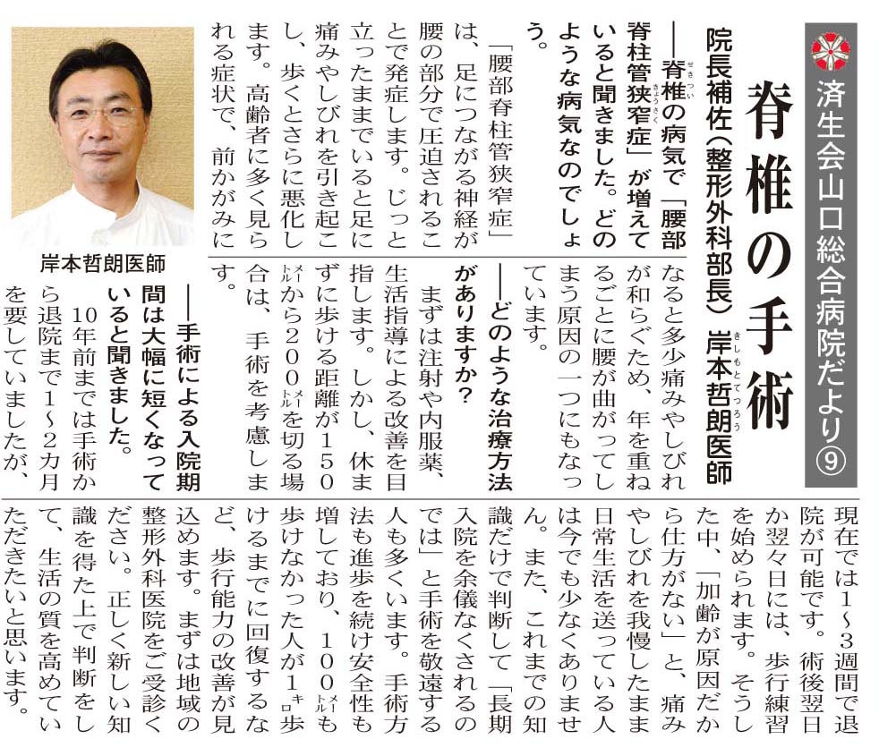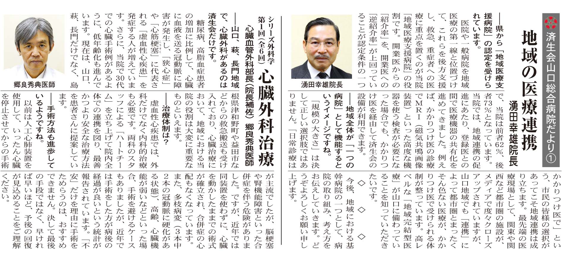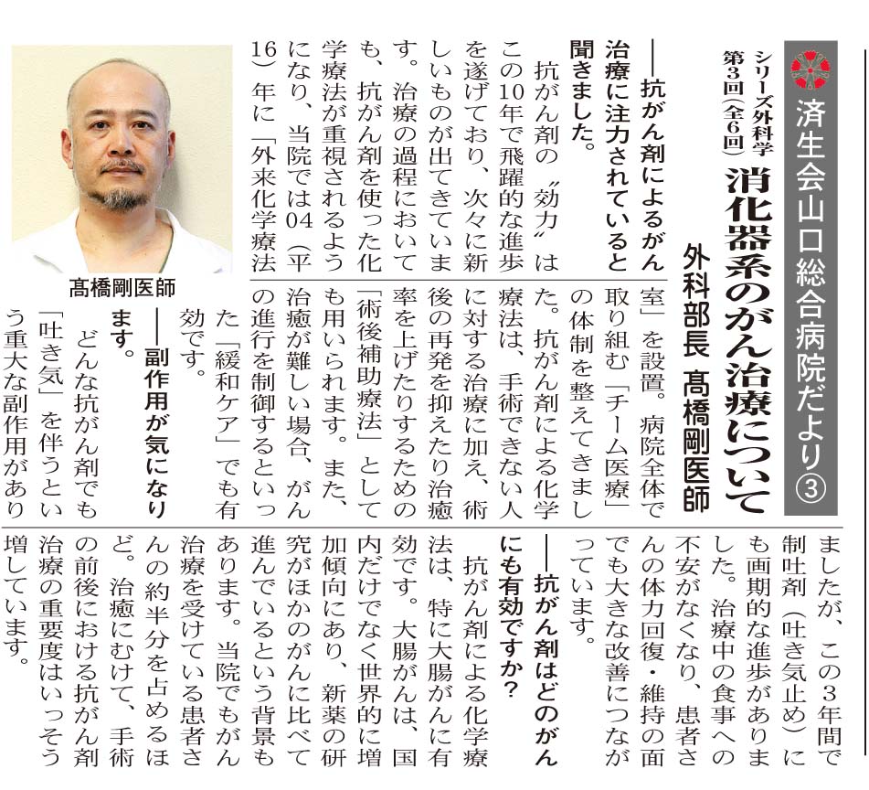 当院では、地域の皆さまに病院の取り組みや考え方をお伝えするため、定期的(毎月第2土曜日)に地方情報紙「サンデー山口(山口版)」に済生会山口総合病院だよりを掲載しております。