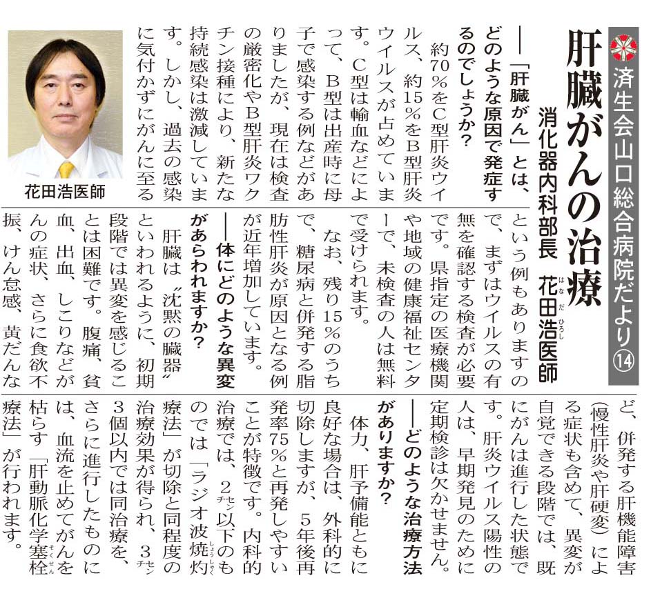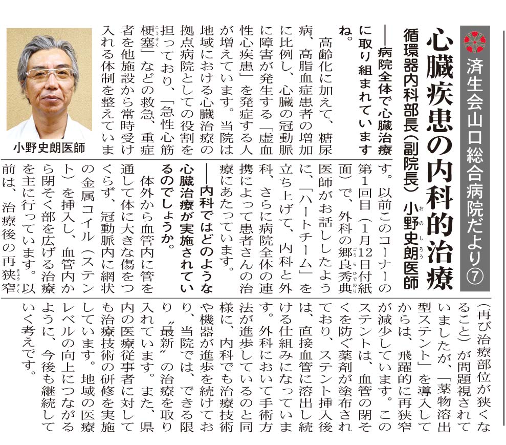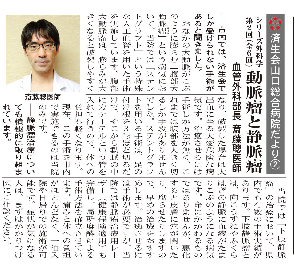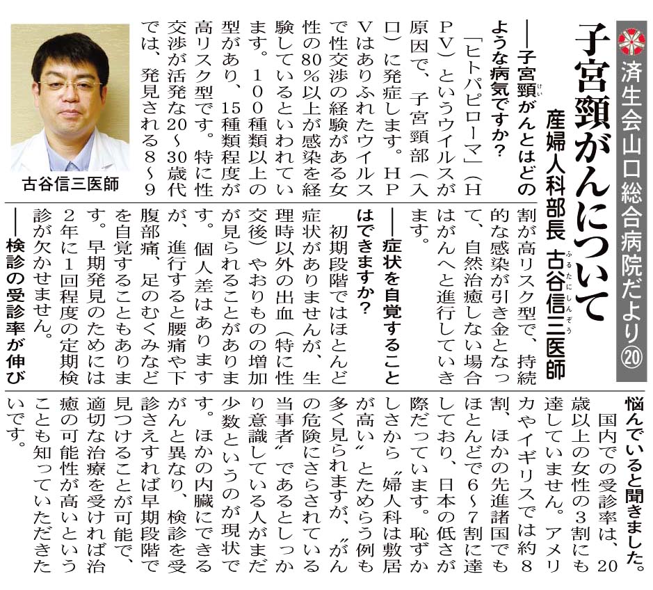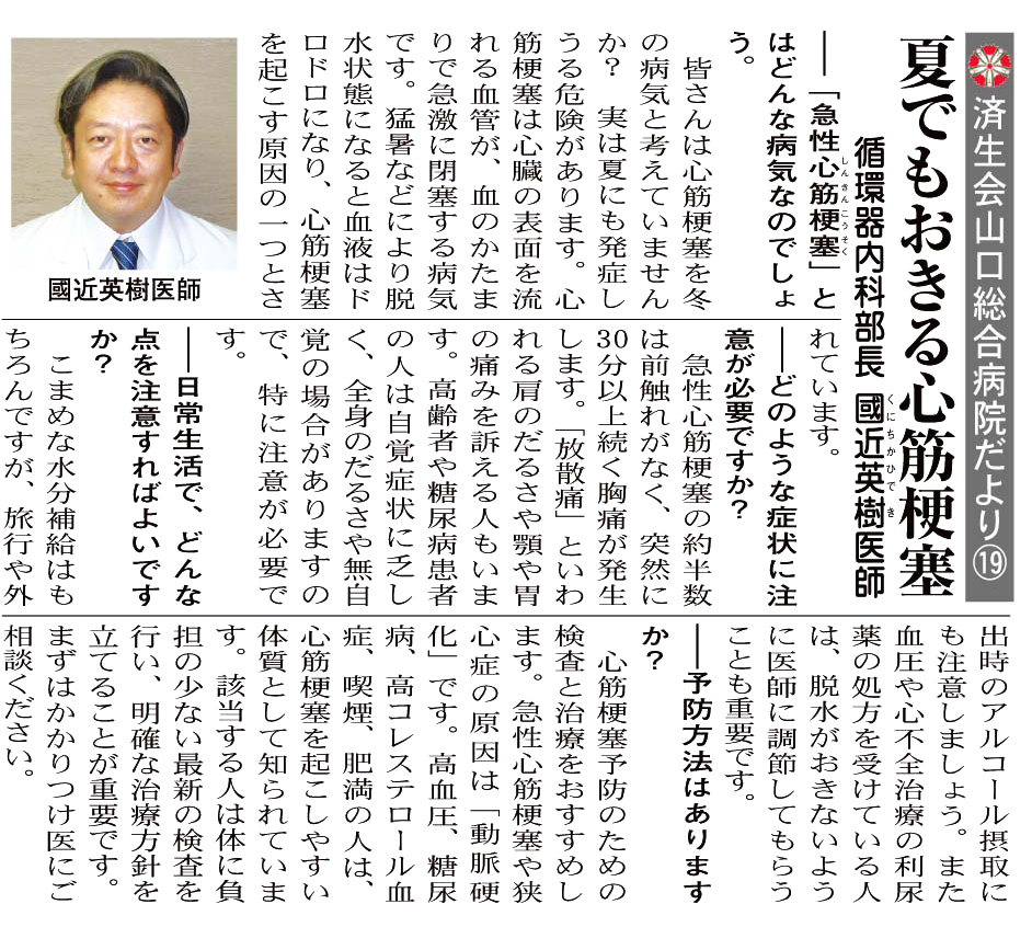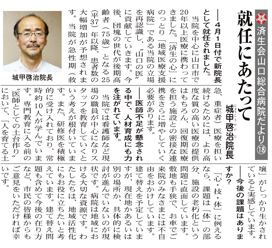 当院では、地域の皆さまに病院の取り組みや考え方をお伝えするため、定期的(毎月第2土曜日)に地方情報紙「サンデー山口(山口版)」に済生会山口総合病院だよりを掲載しております。