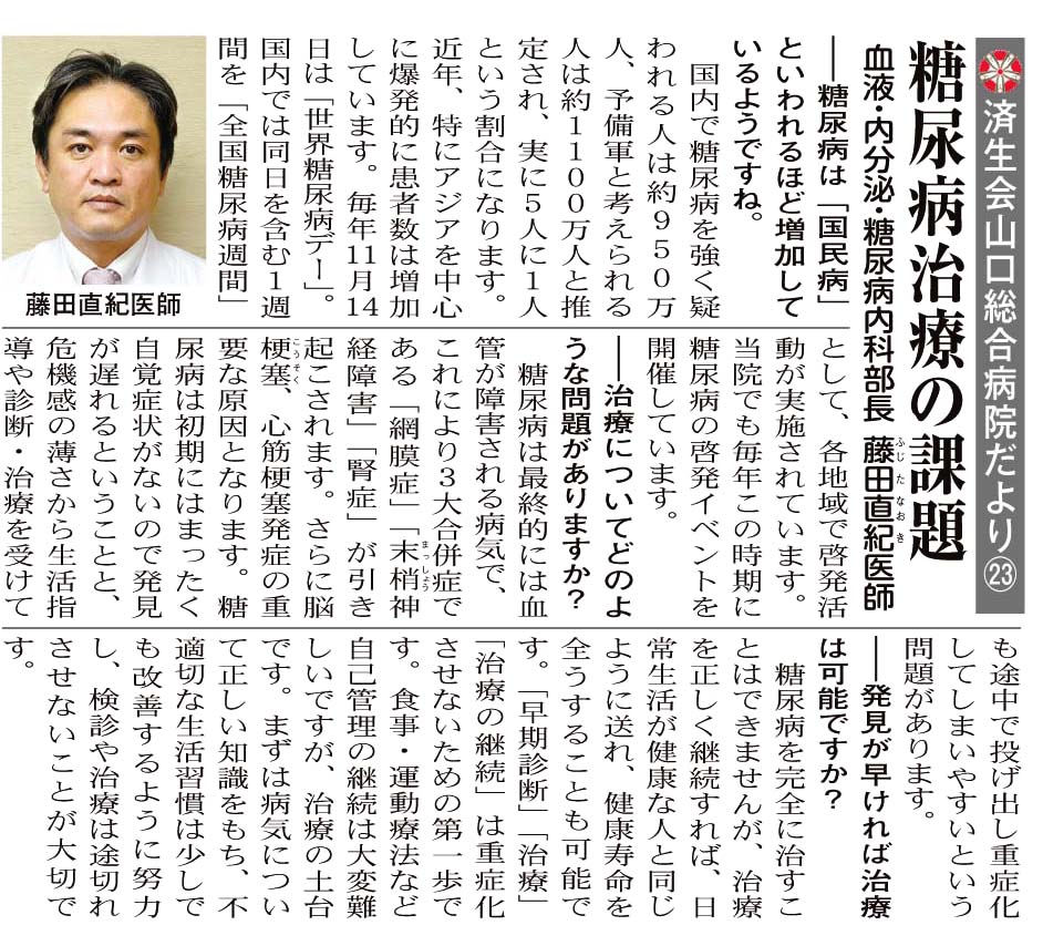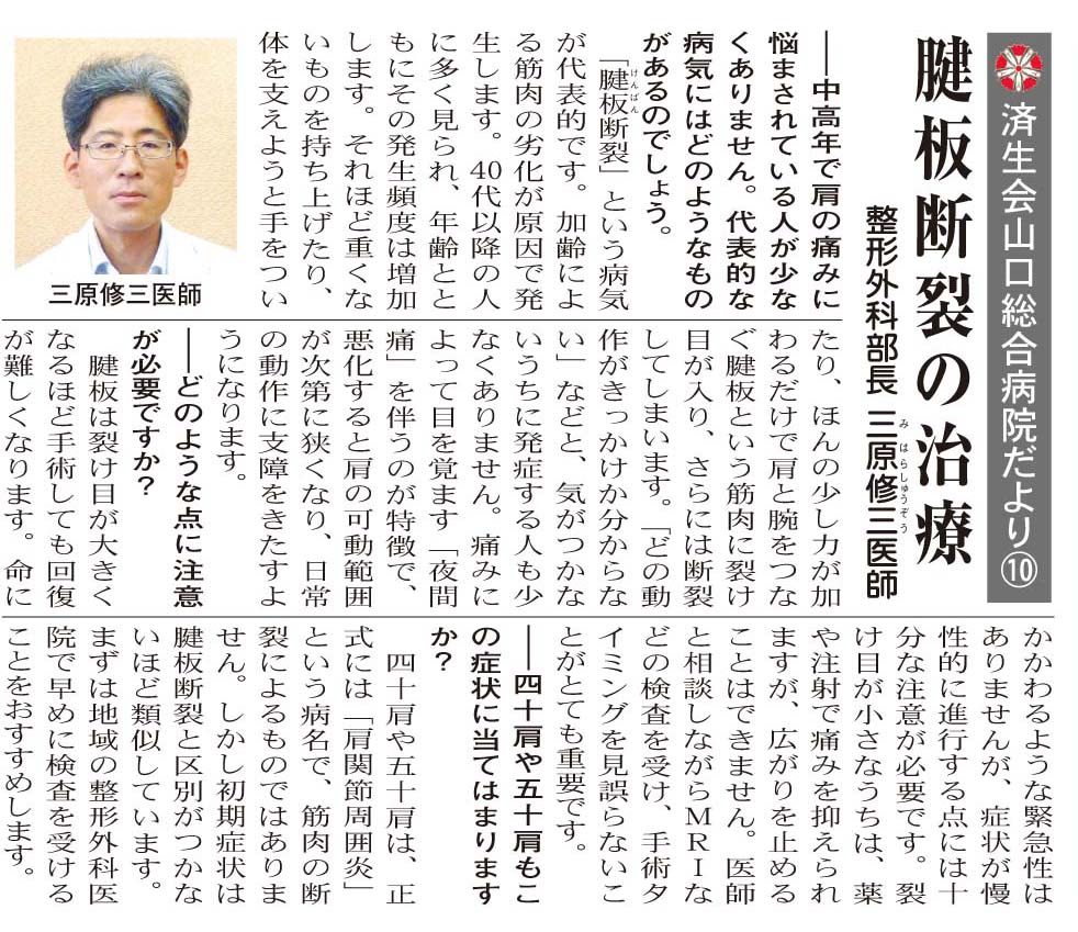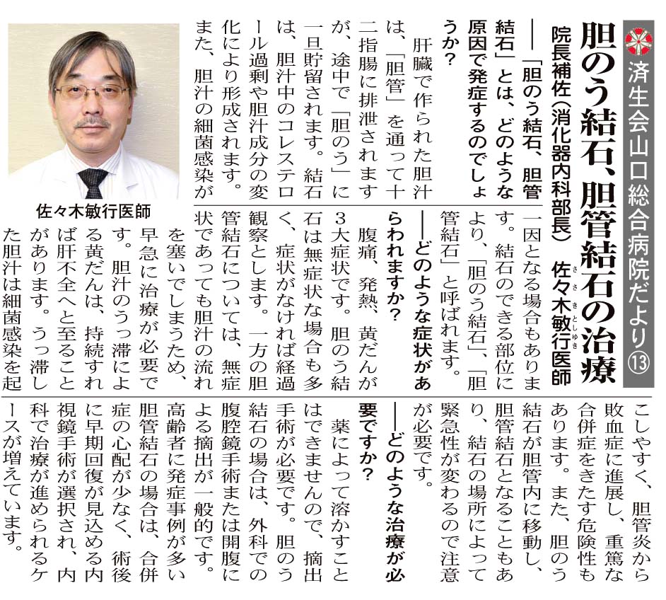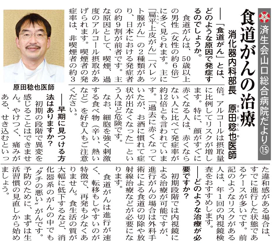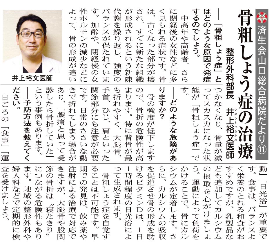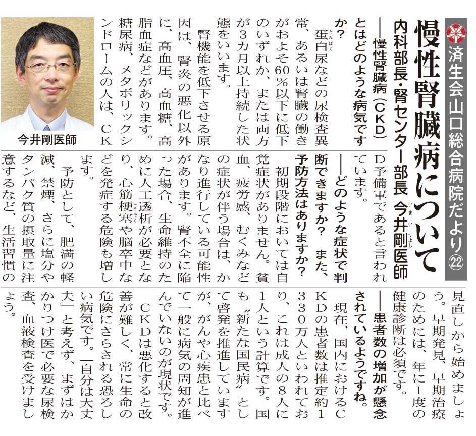 当院では、地域の皆さまに病院の取り組みや考え方をお伝えするため、定期的(毎月第2土曜日)に地方情報紙「サンデー山口(山口版)」に済生会山口総合病院だよりを掲載しております。